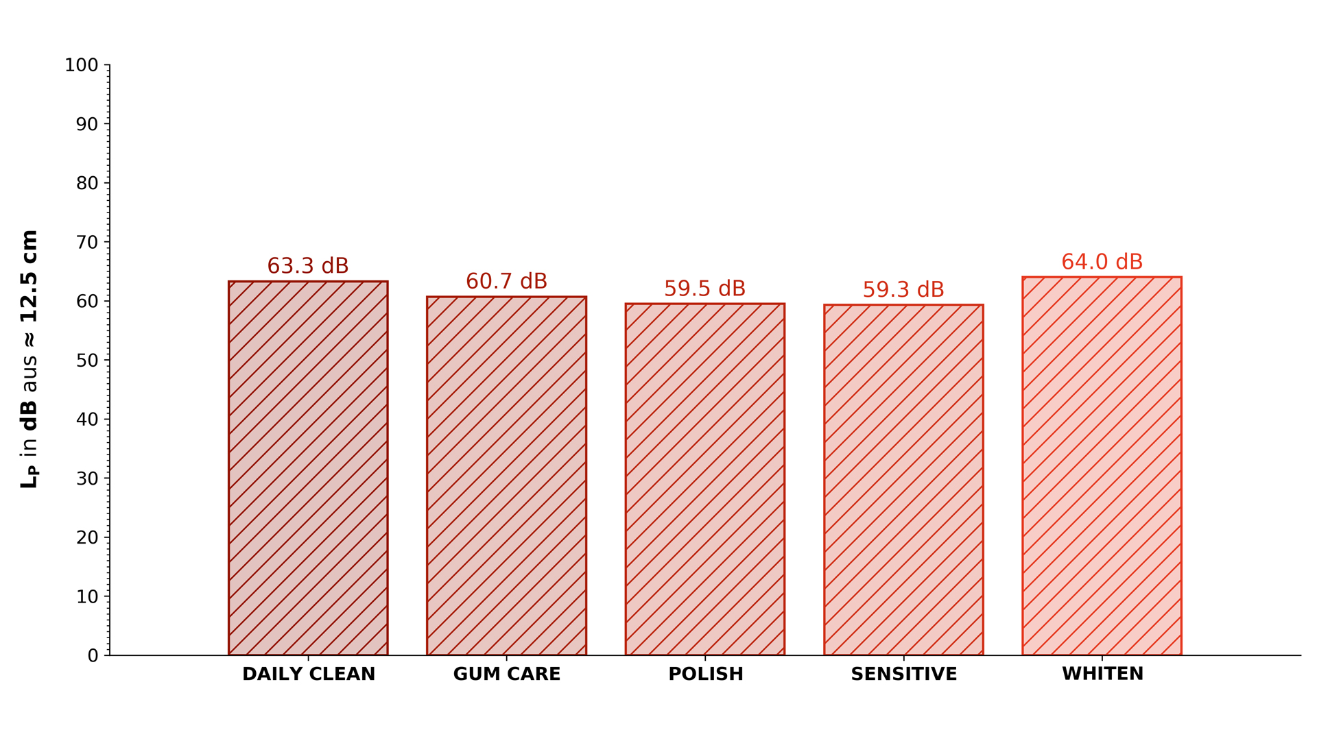 Schließlich war auch noch der während des Zähneputzens in dem nach dem Willen des Herstellers zu verwendenden Modus wahrnehmbare Schallausstoß wesentlich: Wir maßen denselben aus einem Abstand von ≈ 12,5 cm zu der Mitte des Modellkörpers.