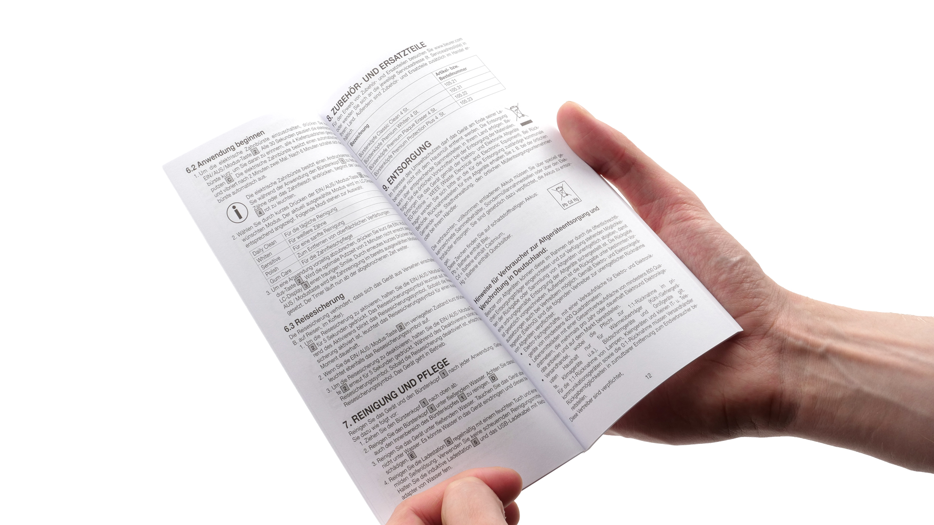 Die Bedienungsanleitung veranschaulicht alles, was man zum Umgang mit dem Modell wissen muss, in anschaulichen Texten und Graphiken. Nur dass die Schriftgröße recht gering ausfällt und keine detaillierten Hinweise zur Zahnpflege vorhanden sind, ließe sich kritisieren (➞ Die Bedienungsanleitung).
