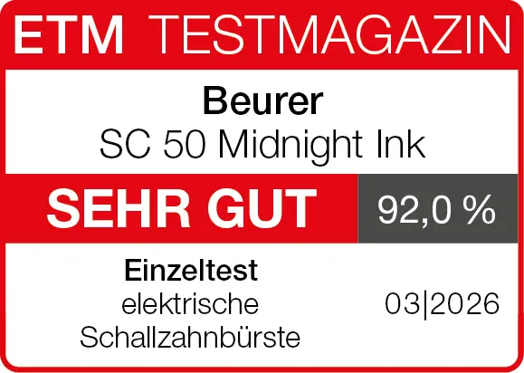 Die starke Zahnreinigungsleistung stellt bloß eine – wenn auch gewichtige – Stärke der SC 50 Midnight Ink von Beurer dar: Daneben überzeugt das Modell unter anderem durch seine einfache Bedienbarkeit sowie insbesondere durch das hochwertige Display. Nur vereinzelt sind wir im Test auf größere Schwächen gestoßen, die sich in der Praxis jedoch kaum negativ bemerkbar machen. Wirklich getrübt wird der positive Gesamteindruck, den diese Schallzahnbürste erzeugt, dadurch also nicht: Deshalb erreicht das Modell in unserem Test 92,0 % und verdient sich damit die Note „sehr gut“.