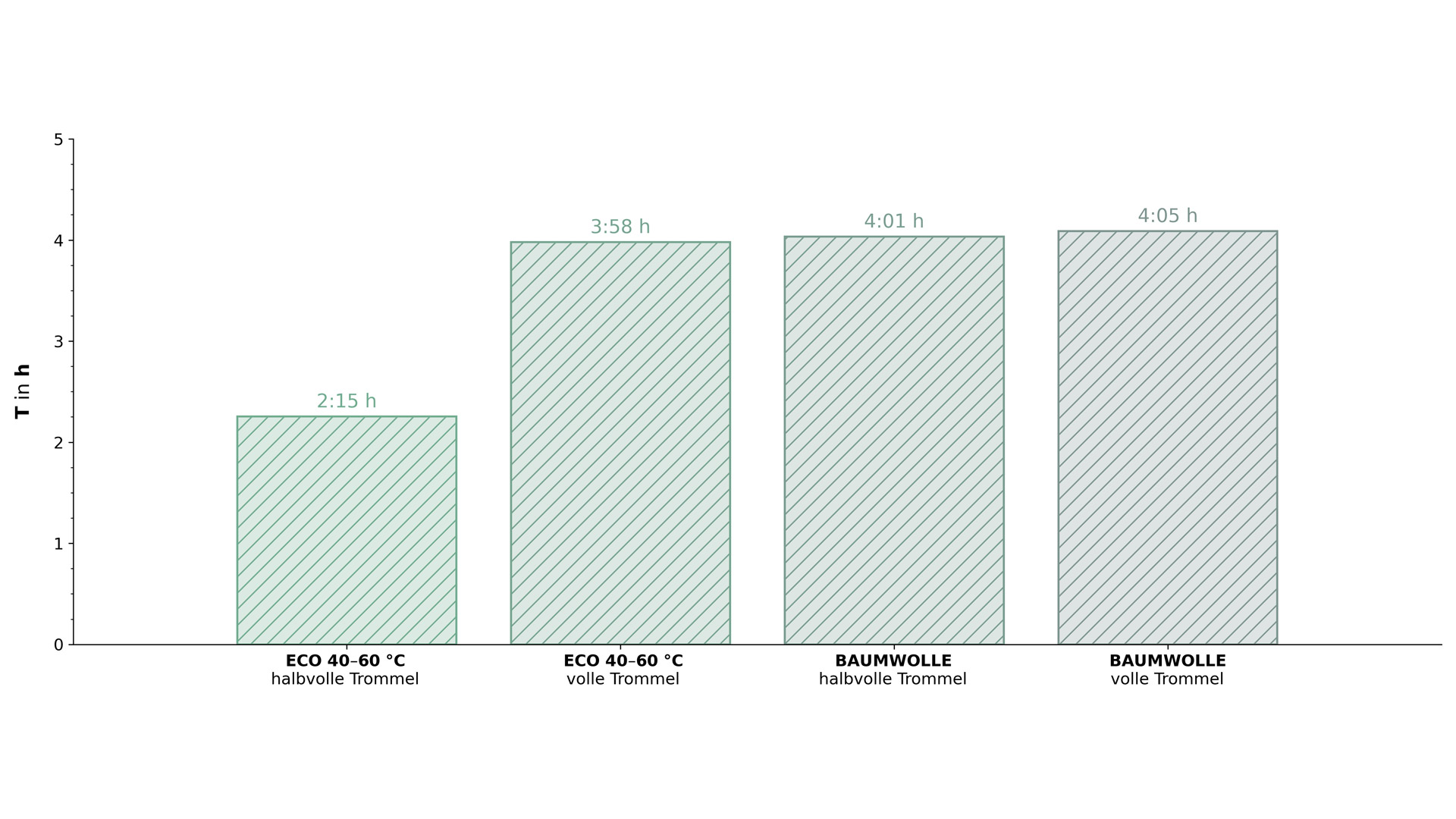Während das Tempo des Wasch-, Spül- und Schleudervorgangs im Waschprogramm ECO 40–60 °C von dem in der Trommel vorhandenen Textilvolumen abhängig ist (≈ 2:15 h versus ≈ 3:58 h), scheint das Textilvolumen im Waschprogramm BAUMWOLLE beinahe gleichgültig zu sein (≈ 4:01 h versus ≈ 4:05 h).