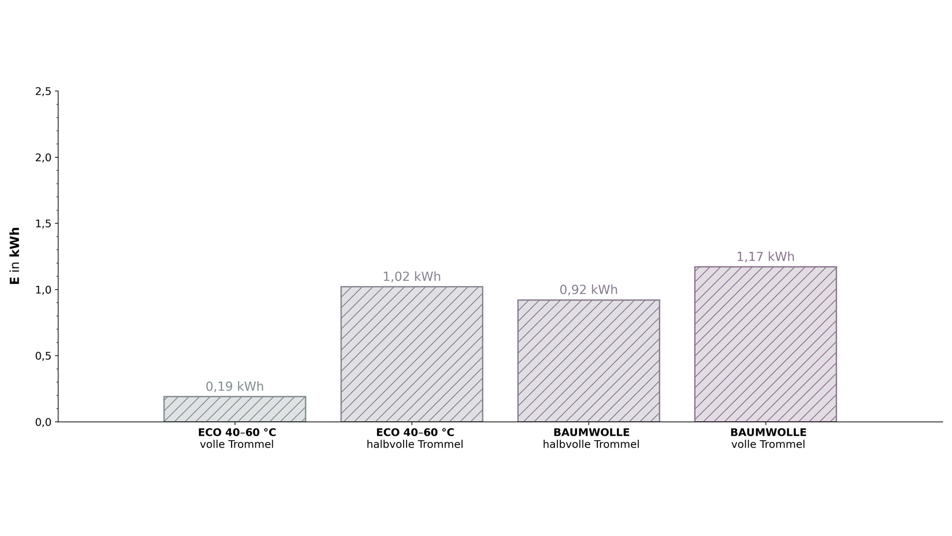 Hier wird erkennbar, wie viel sparsamer der Gebrauch des Waschprogramms ECO 40–60 °C anstelle bspw. des Waschprogramms BAUMWOLLE wirklich ist, vor allem wenn die Trommel des Modells nur zu 50 % voll ist (≈ 0,19 kWh versus ≈ 0,92 kWh). Was aber wirklich verwundern muss: Diese schon sehr erhebliche Verbrauchsdiskrepanz wird in Teilen nivelliert, wenn die Trommel des Modells zu 100 % voll ist (≈ 1,02 kWh versus ≈ 1,17 kWh).