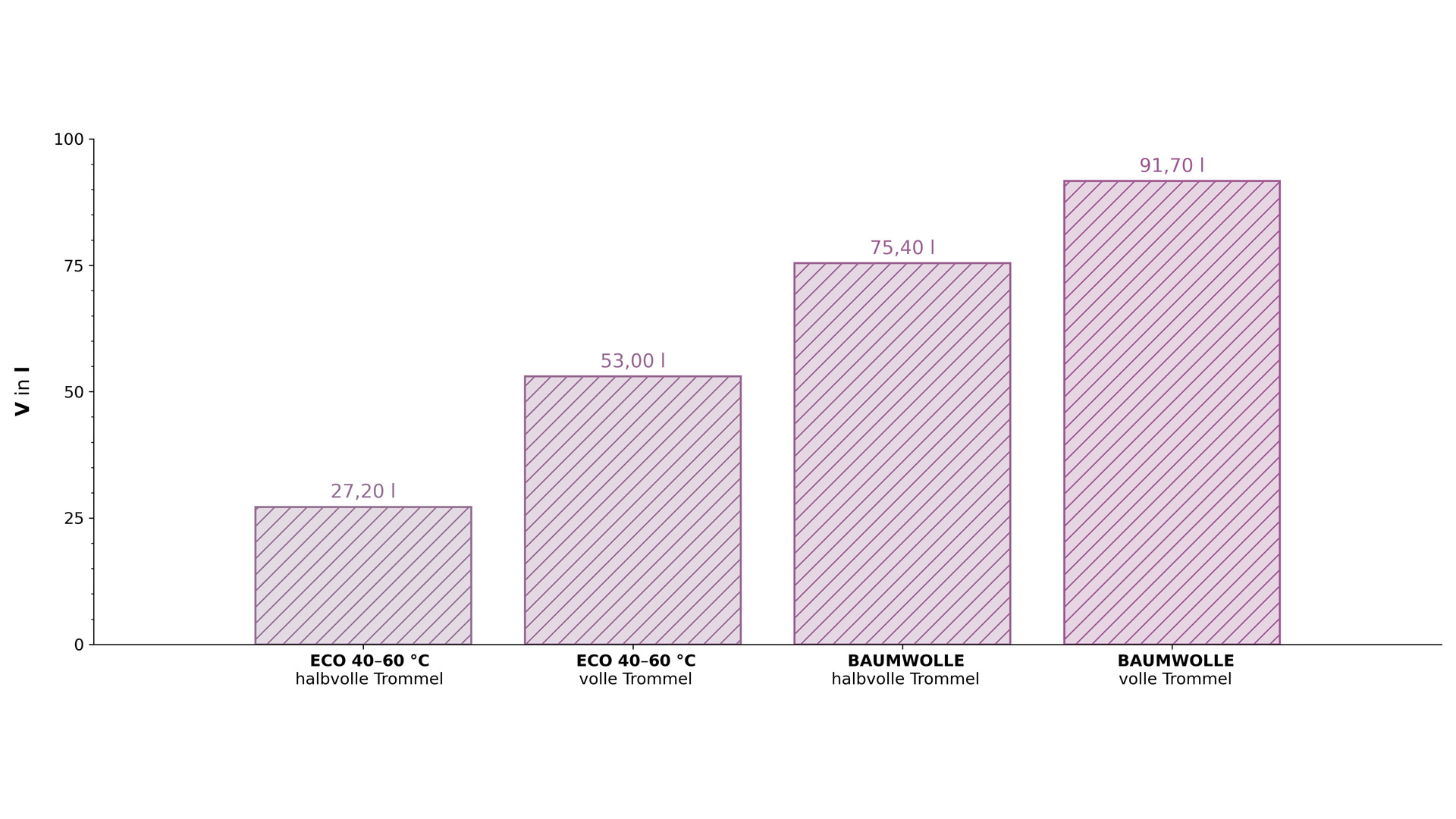 Gleiches lässt sich auch anhand des Wasserverbrauchs erkennen: Hier ist der Gebrauch des Waschprogramms ECO 40–60 °C aber immer sehr viel sparsamer als bspw. des Waschprogramms BAUMWOLLE, einerlei ob die Trommel des Modells nun zu 50 % (≈ 27,20 l versus ≈ 75,40 l) oder aber zu 100 % (≈ 53,00 l versus ≈ 91,70 l) voll ist. Die Wasserverbräuche des Waschprogramms BAUMWOLLE sind enorm, was in der Praxis aber wohl niemanden ernstlich belasten wird: Schließlich ist der Wasserpreis hierzulande wirklich alles andere als erheblich.